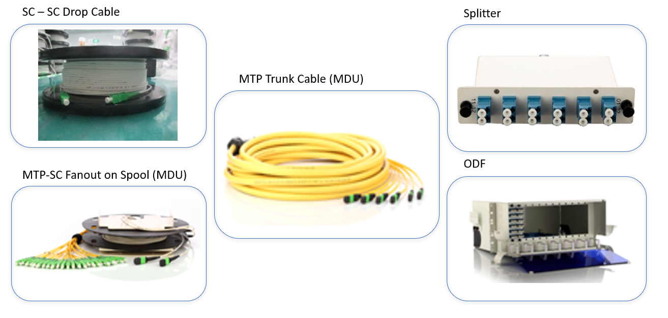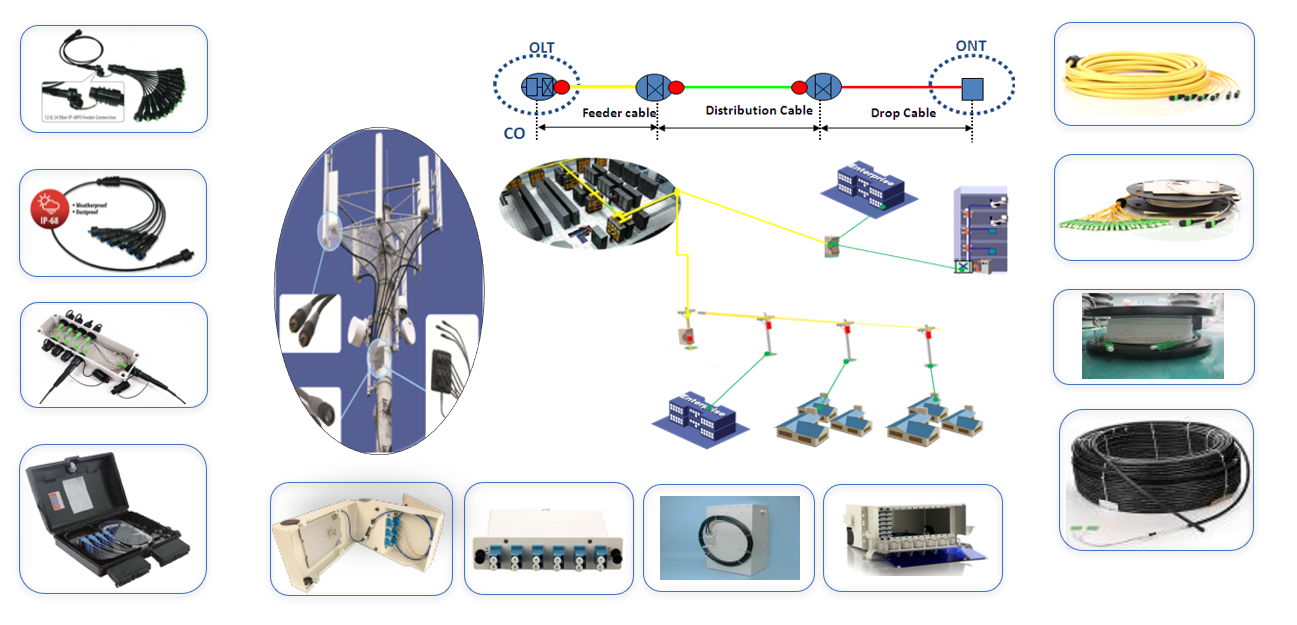 drop cables, splitters, ODF (optical distribution frame), FDH (fiber distribution hub), and fiber