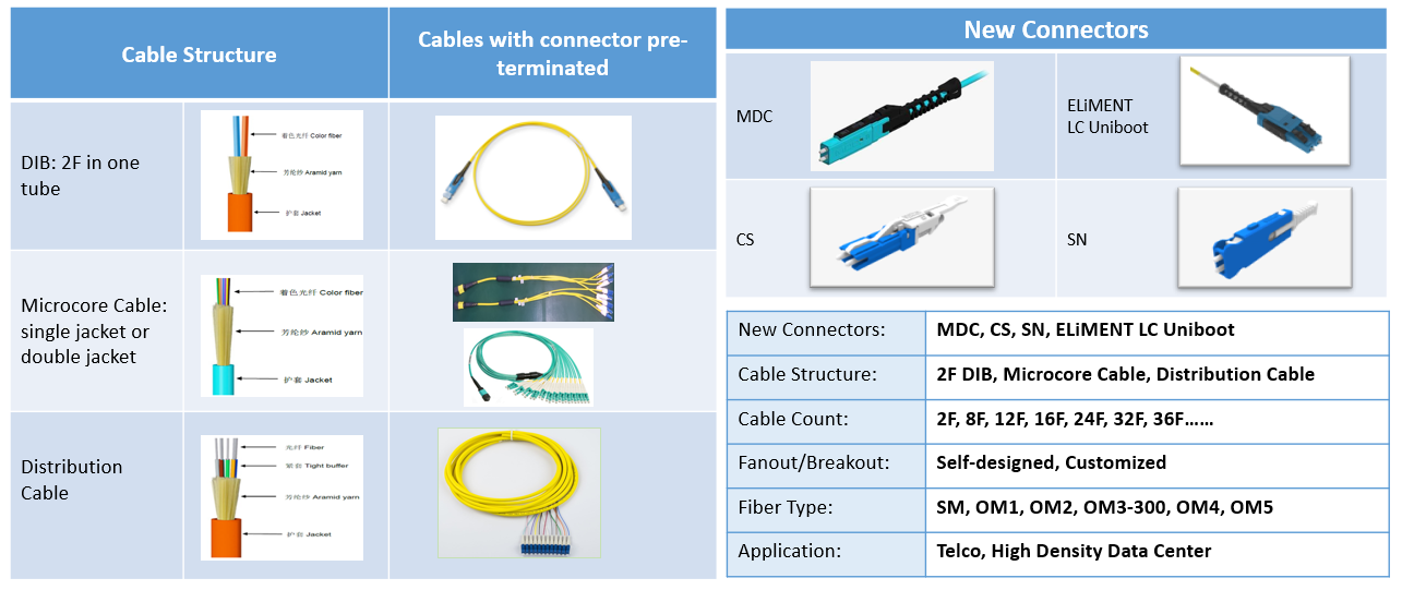 Tight Buffered Fiber, Simplex/Duplex Cable, Micro-core Cable, Double sheath Cable, Distribution Cable